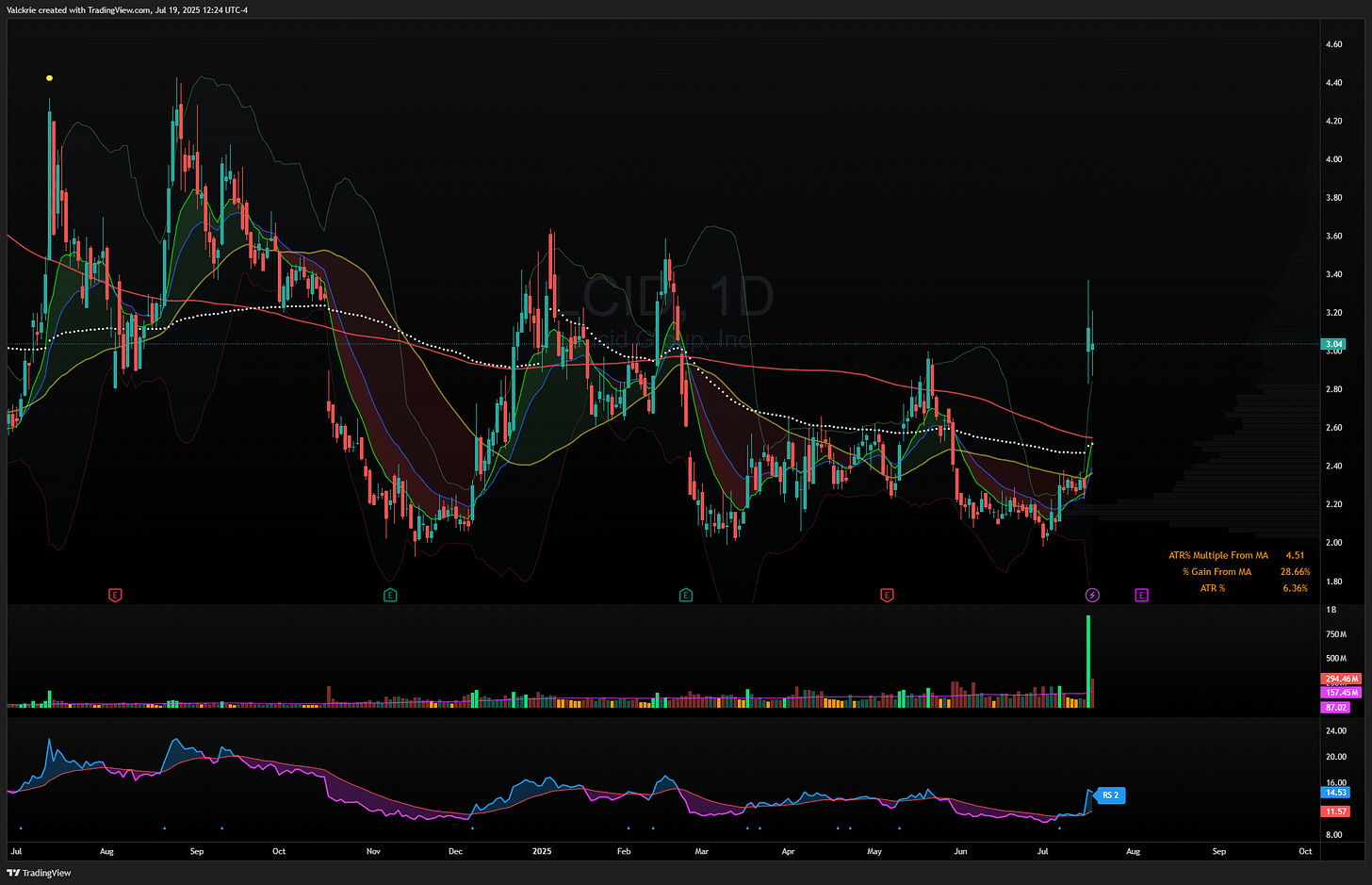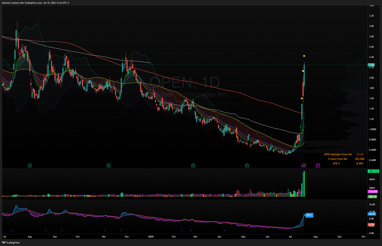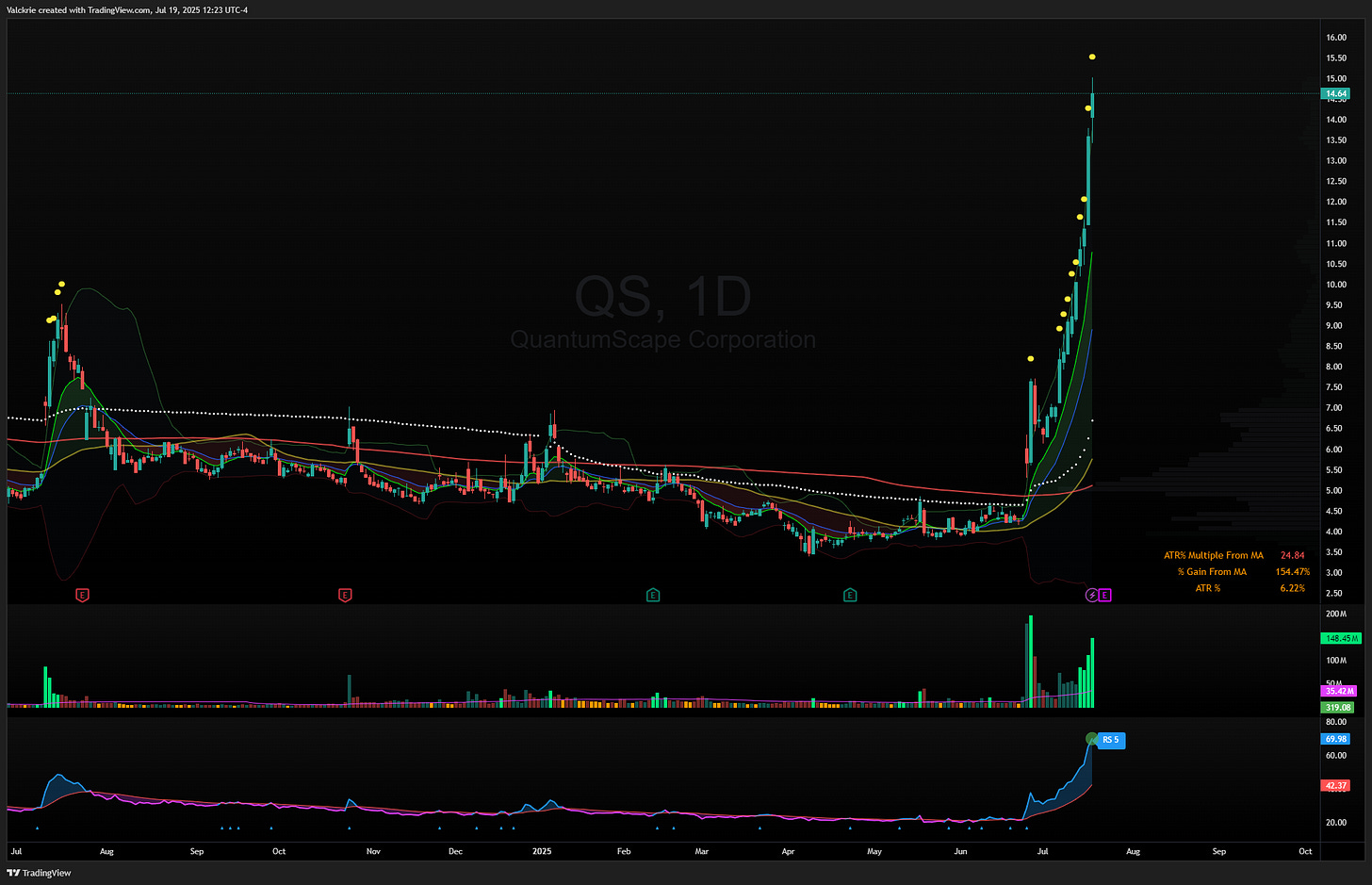 QuantumScape (QS 0.00%↑) began rallying in late June on heavy volume following positive news regarding its next-generation battery development. Since then, the stock has gone parabolic and is now looking extremely extended. With earnings scheduled for Wednesday, the stock is on watch for a potential exhaustion reversal short trade.