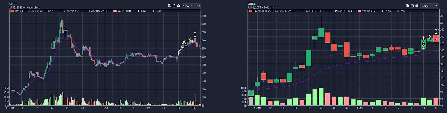CRCL 0.00%↑ breakout from a tight daily range and rallied for a few days into the GENIUS Act on Friday where it saw a reversal: