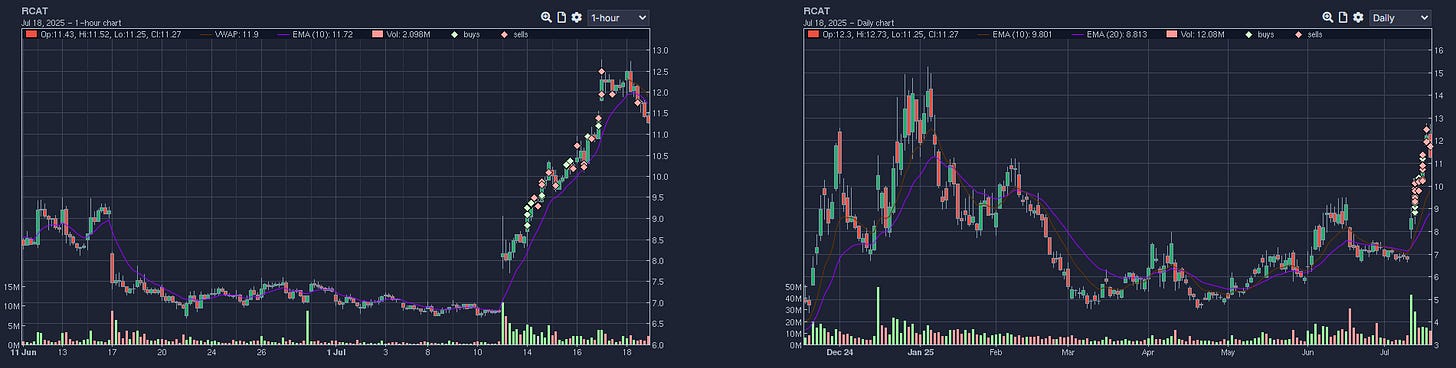 RCAT 0.00%↑ breakout was an idea mentioned in last weeks post. The long entry was over the highs of the gap up day around $9 and also through the $9.50 prior daily pivot. The exit was on the break of the daily bar low on Friday: