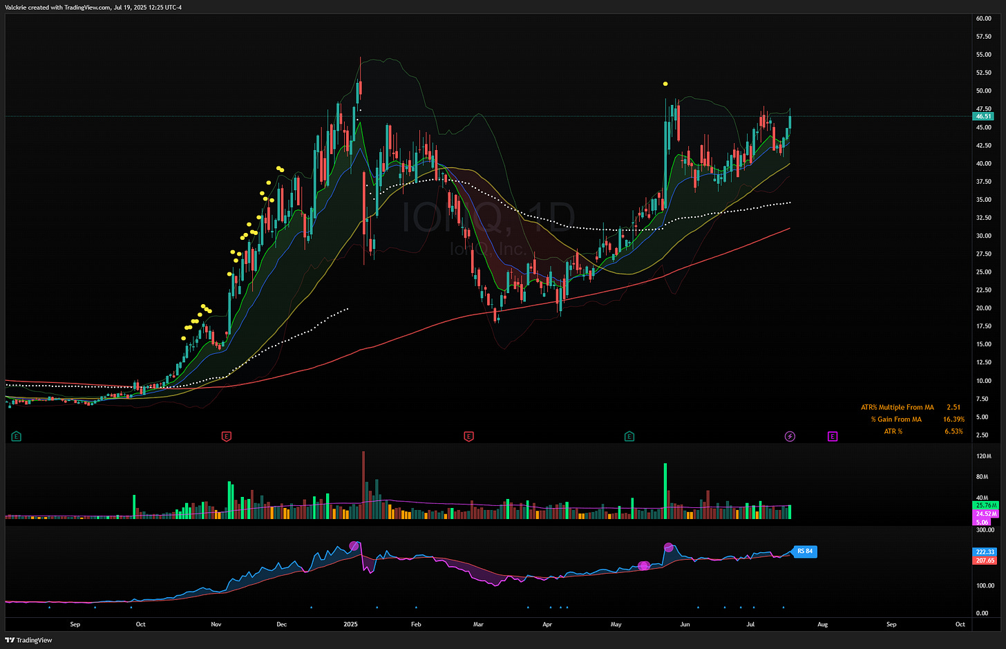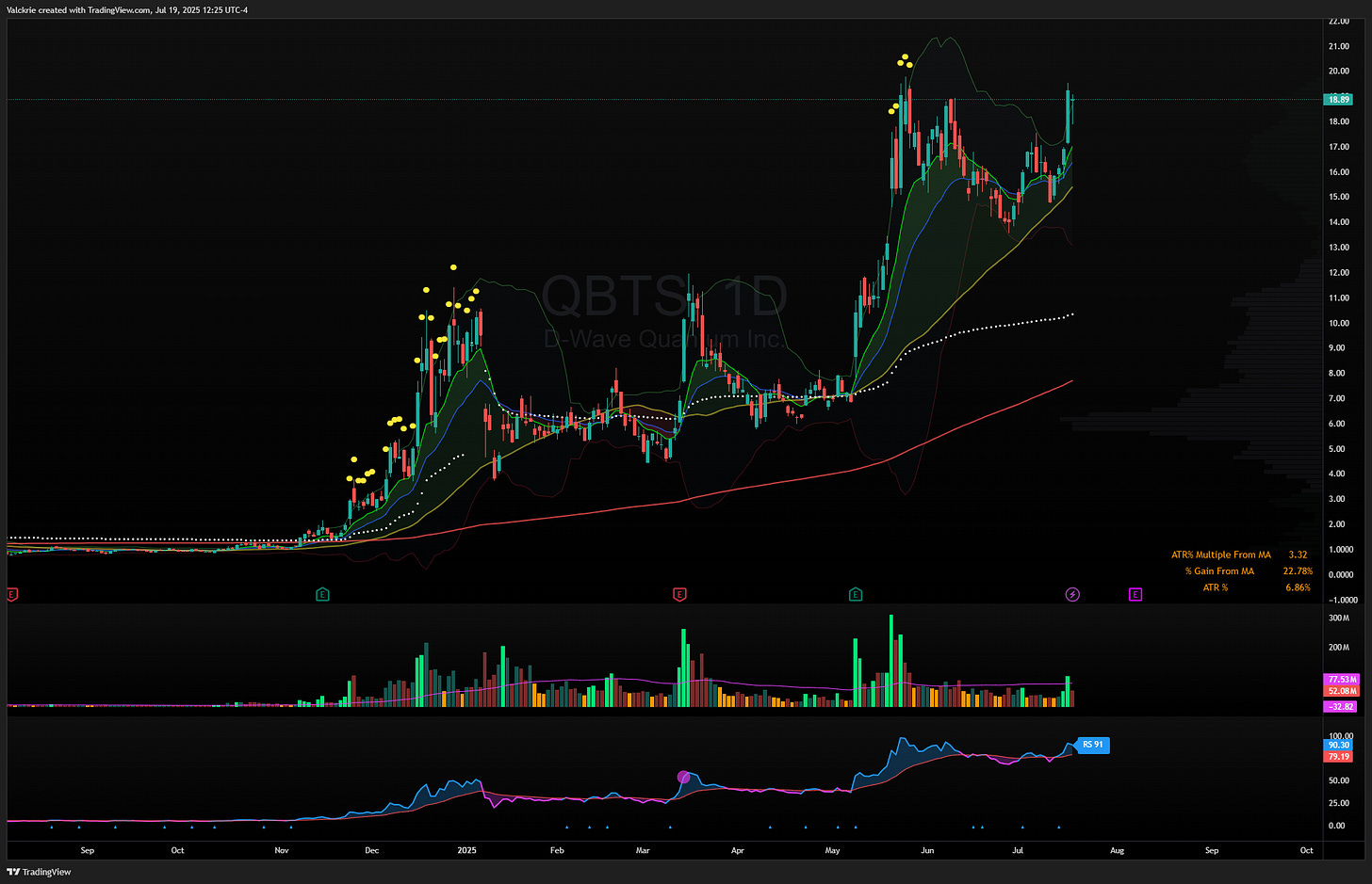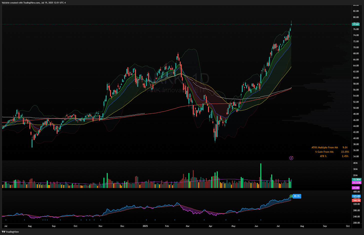 Growth momentum stocks in the small and mid-cap space are having a very strong month, with sectors like space, quantum computing, and nuclear energy seeing major rallies. While many of these names are currently extended, they continue to hold their bullish trends. This strength is evident in the ARKK 0.00%↑ ETF, which broke out in early June, but is now becoming extended from the moving averages and trading above its upper Bollinger Band.