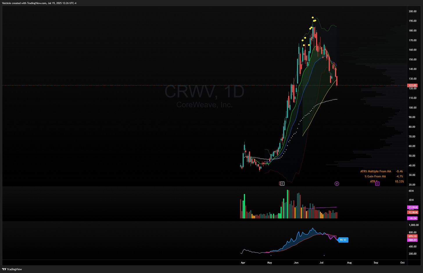 CoreWeave (CRWV 0.00%↑) has been in a steady downtrend over the past couple of weeks, showing continued weakness. It’s on watch for further selling pressure, but if a sharper flush occurs, it could set up a bounce or oversold reversal trade.