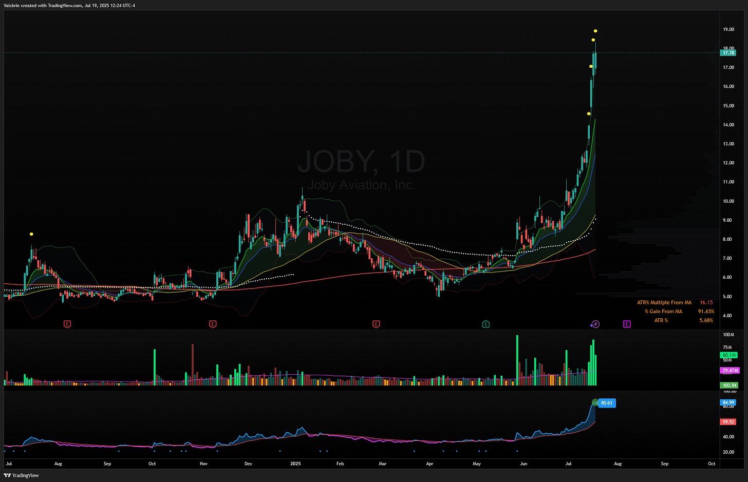JOBY Aviation (JOBY 0.00%↑) has surged over 100% in just a few weeks after breaking out to new 52-week highs. The stock has posted multiple consecutive up days and is now significantly extended. It’s on watch for a short-term reversal setup, particularly as momentum shows signs of exhaustion.