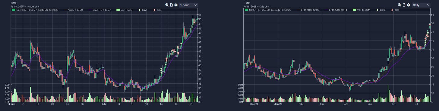 SMR 0.00%↑ breakout from a range near the 10 and 20 daily EMA area into new highs, still holding a position:
