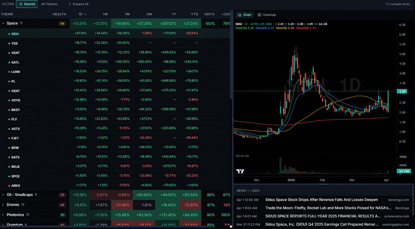 Within the space stock basket, names worth tracking include RKLB 0.00%↑ LUNR 0.00%↑ PL 0.00%↑ FLY 0.00%↑ ASTS 0.00%↑ RDW 0.00%↑ SATS 0.00%↑ SATL 0.00%↑ GSAT 0.00%↑ VOYG 0.00%↑ BKSY 0.00%↑ FJET 0.00%↑ SIDU 0.00%↑ YSS 0.00%↑ SPCE 0.00%↑.