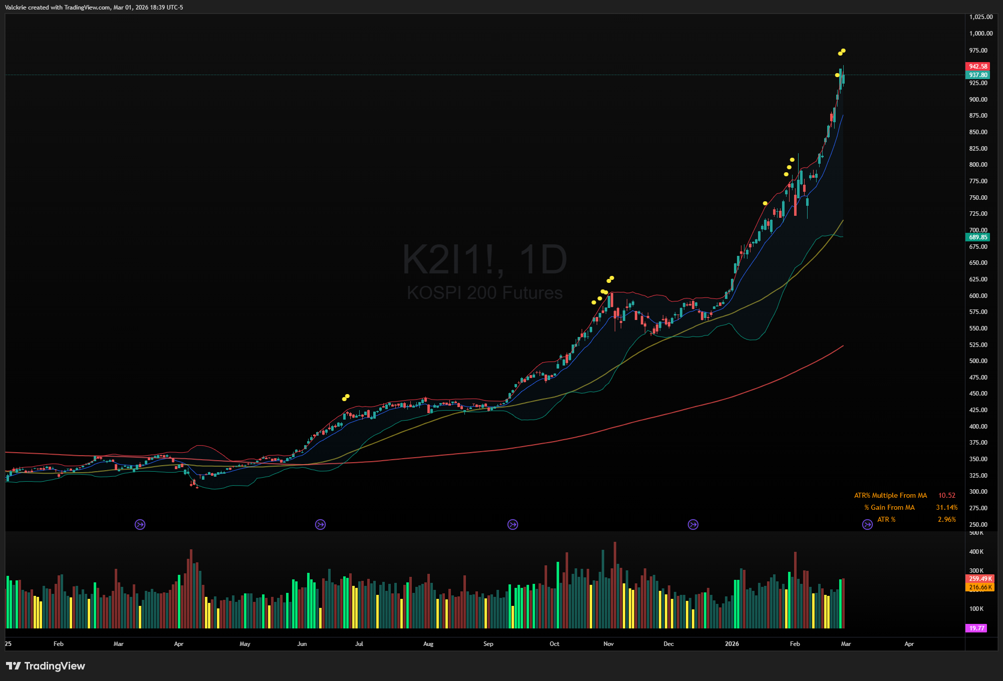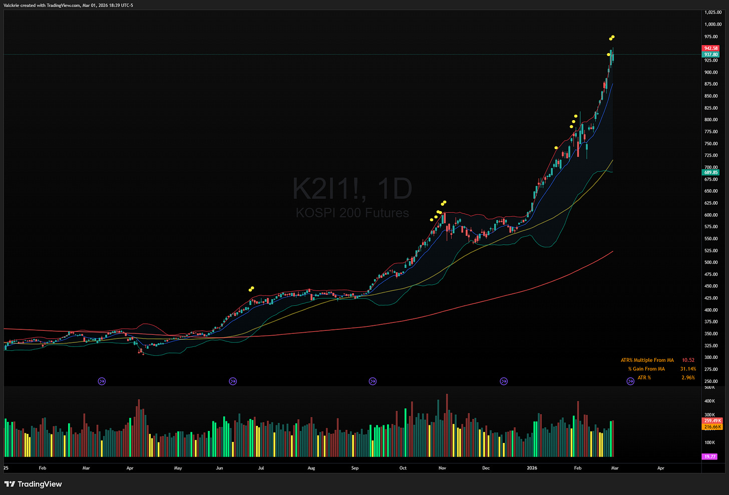 This remains a top watch in the coming weeks. Parabolic moves like this tend to produce the highest volatility near the peaks, and the concentration risk in Samsung and SK Hynix is extreme. Any disruption to the memory cycle or a shift in HBM demand expectations could trigger a sharp correction. Keep it on the radar.