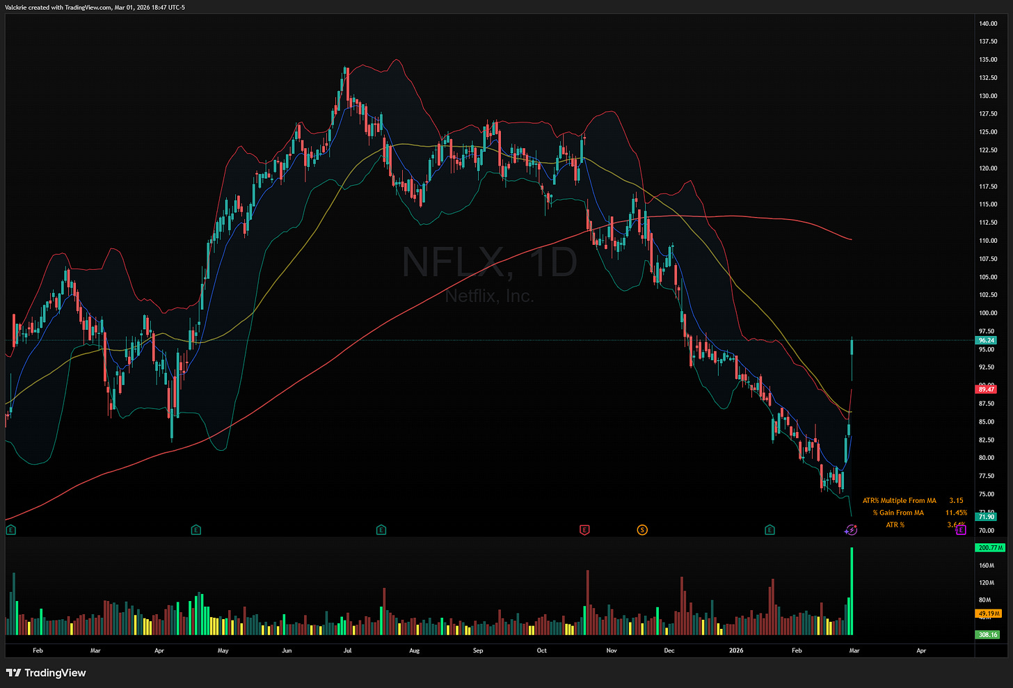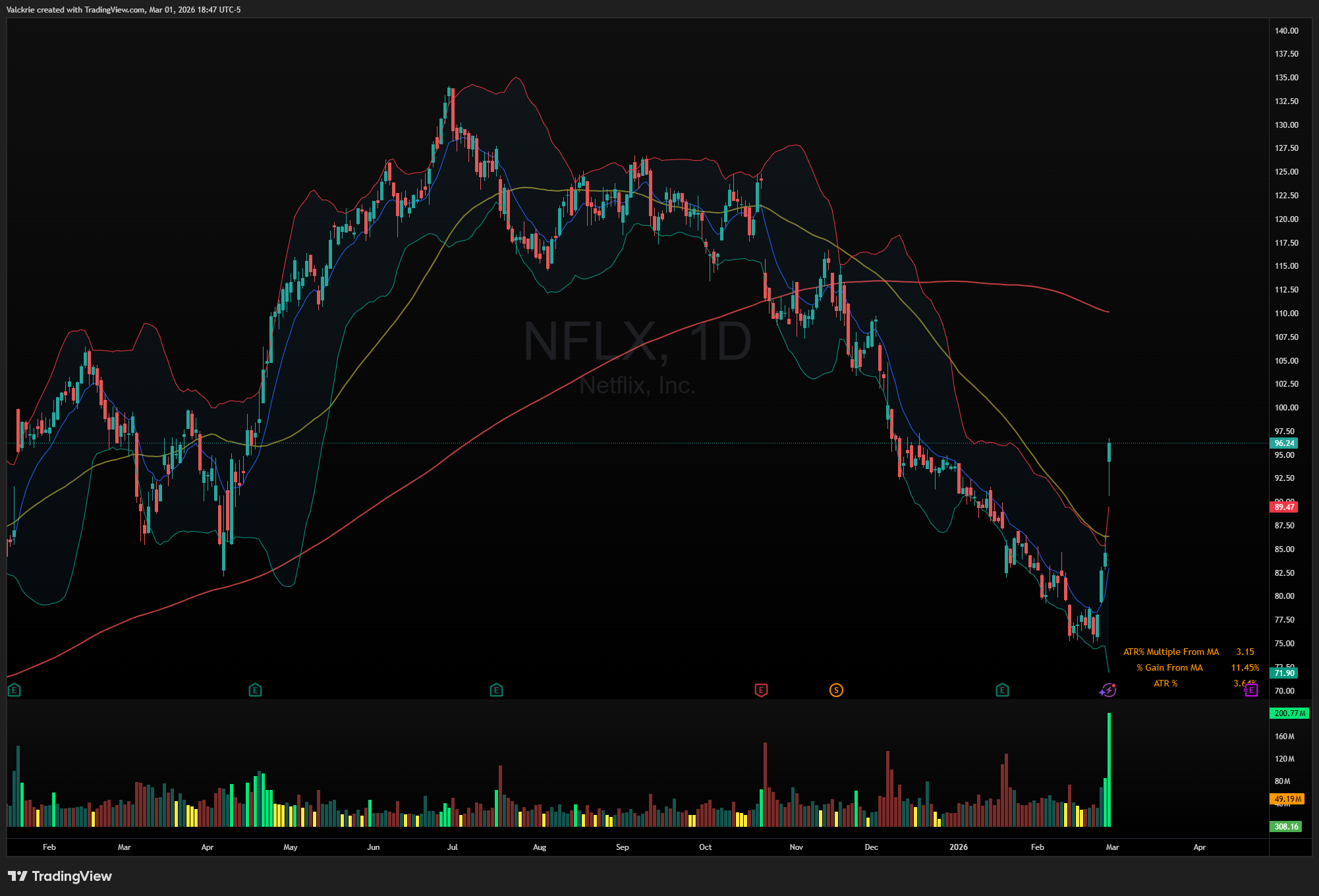 NFLX 0.00%↑ after walking away from the WBD merger on Thursday. Paramount Skydance’s $31/share bid was deemed a “superior proposal,” Netflix declined to match, and collected a $2.8 billion termination fee for its trouble. The stock closed up over 13% on the day on relief that the deal is dead.
