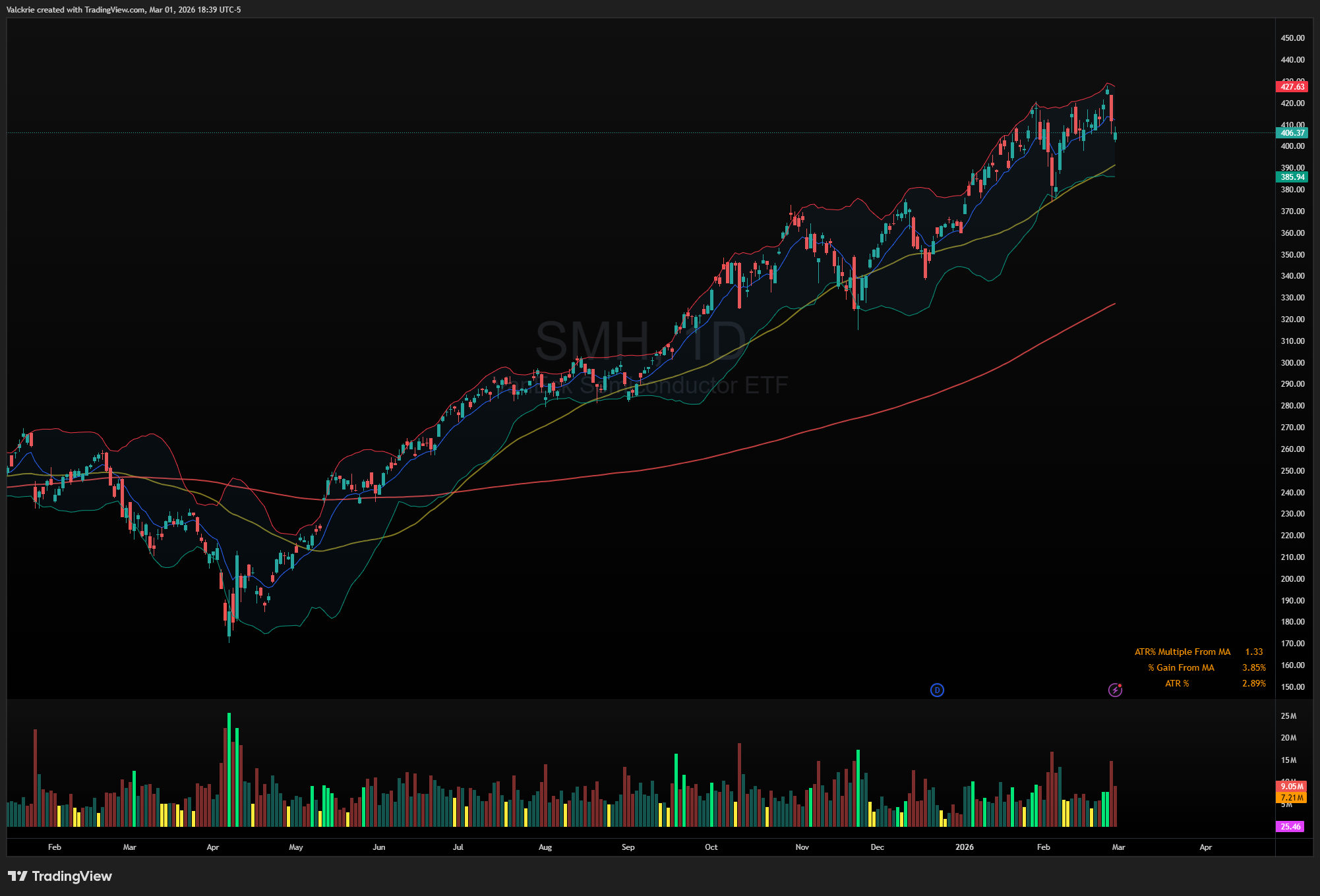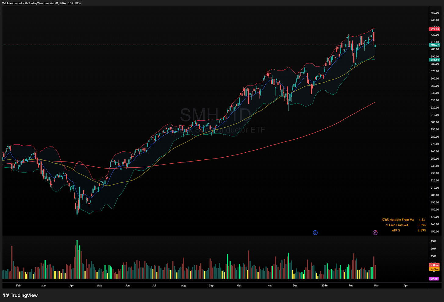 SMH also flashed a false breakout, briefly tagging new highs around $427 before fading sharply into the end of the week. The 52-week range now reads $170 to $428, and that mid-week rejection at resistance is worth noting for anyone watching semis closely.