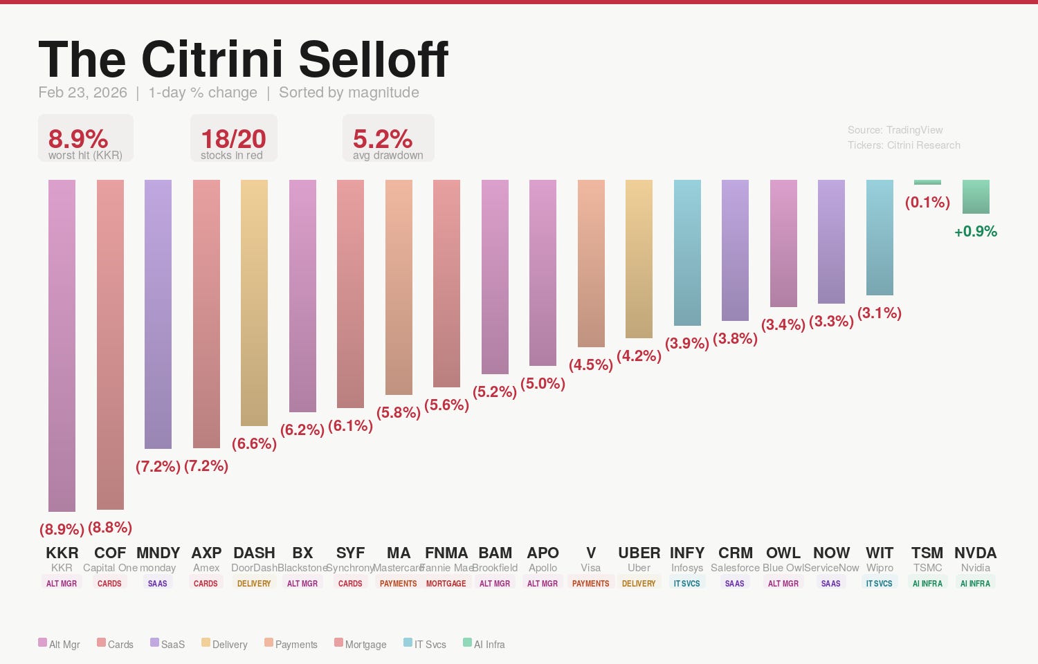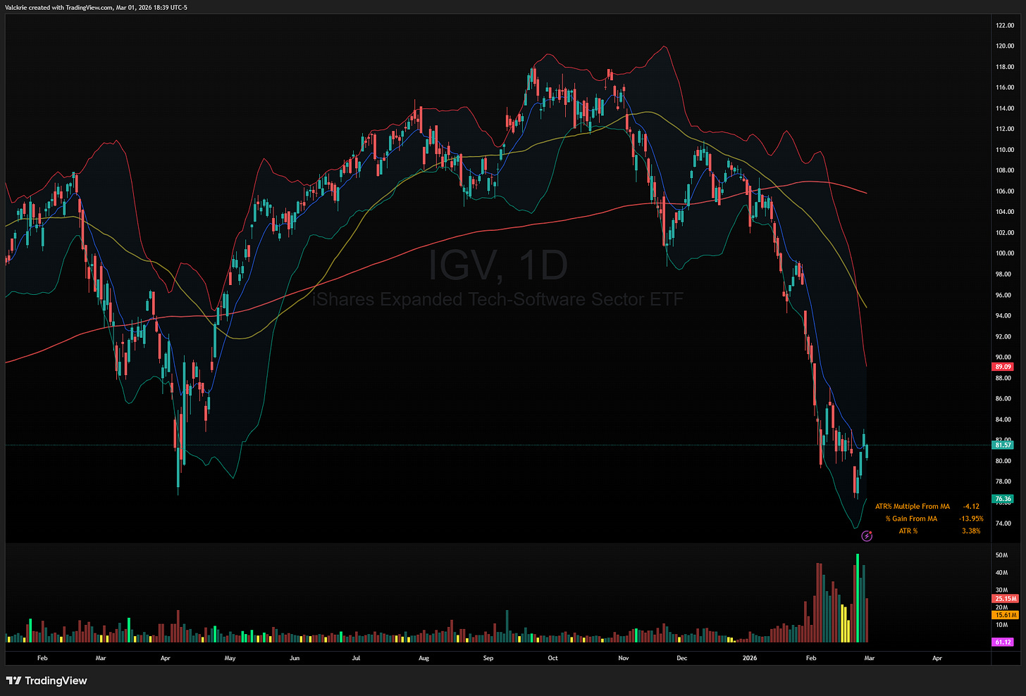 The damage was immediate. Enterprise software stocks bore the brunt, with IGV hitting new 52-week lows, falling around 5% on Monday alone and extending its brutal 2026 decline to nearly -30% YTD. Financials and services companies named in the piece also took collateral damage, as markets priced in the second-order implications of AI-driven disruption to lending, insurance, and intermediation businesses.