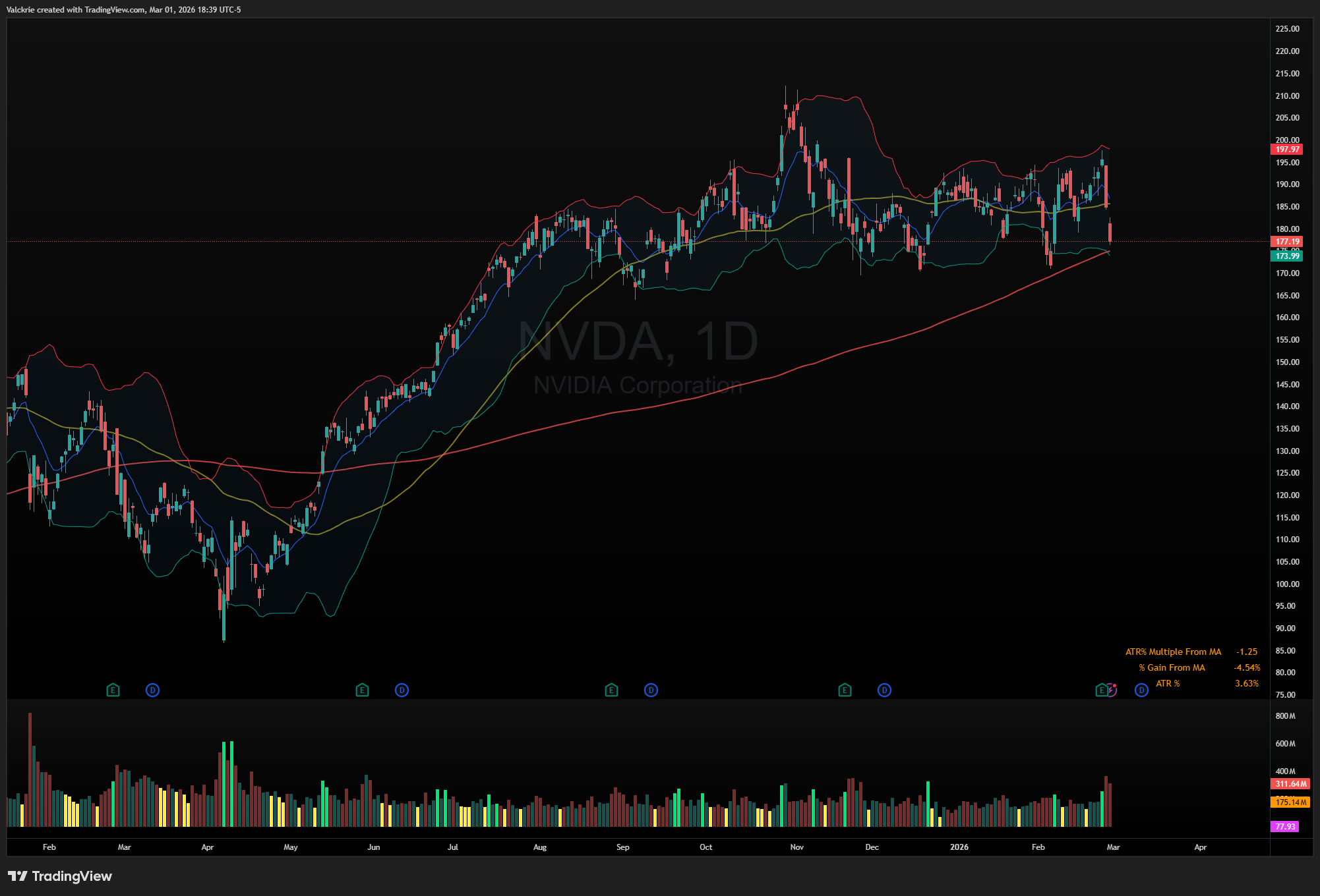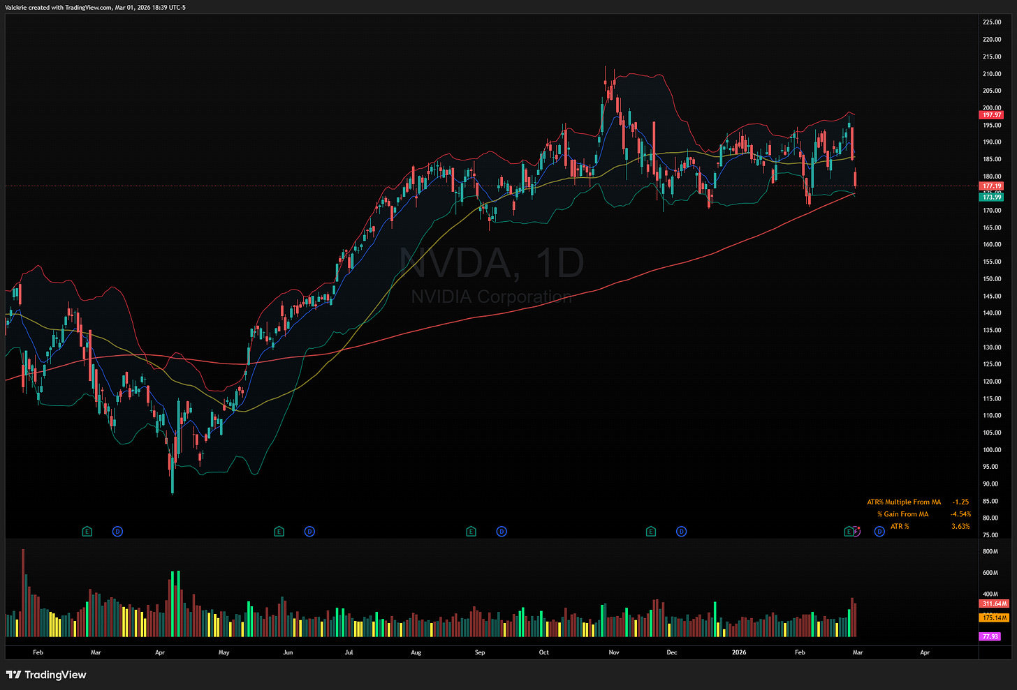 NVDA 0.00%↑ remains on watch after selling off post-earnings despite beating on every metric. The stock dropped to $177 by Friday’s close, well below its mid-week highs, and has now spent over four months unable to break out of the $170-$210 range.