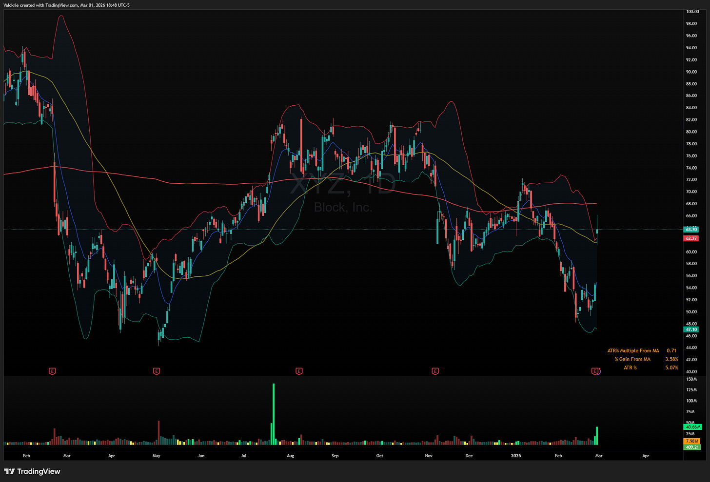 XYZ 0.00%↑ (Block) after Jack Dorsey cut nearly half the workforce, laying off 4,000 employees, and directly attributed the decision to AI efficiency gains. Dorsey predicted most companies will make similar structural changes within the next year. This is both a company-specific catalyst and a broader signal for the AI-displacement theme that has been weighing on software and services all year.