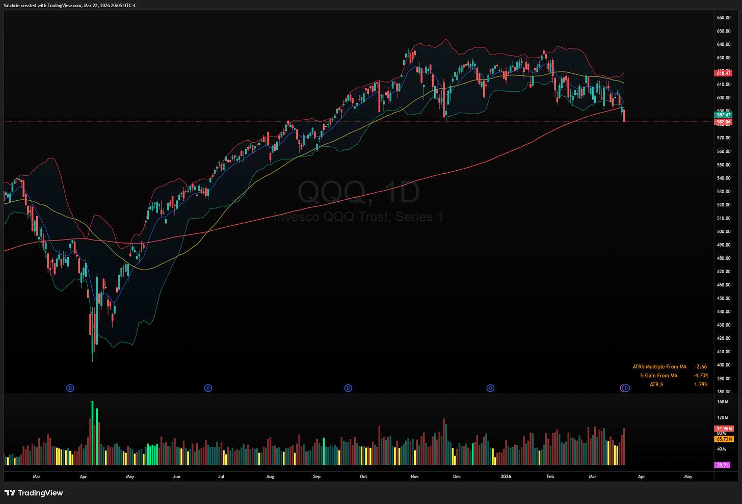 The Nasdaq closed below its 200-day SMA on Wednesday following the post-FOMC selloff, falling through its November low in the process. The more significant development this week was QQQ 0.00%↑ finally breaking down from the choppy consolidation range it had been grinding in since early February. That breakdown resolved the indecision decisively to the downside, with triple witching options expiry on Friday adding a further layer of selling pressure.