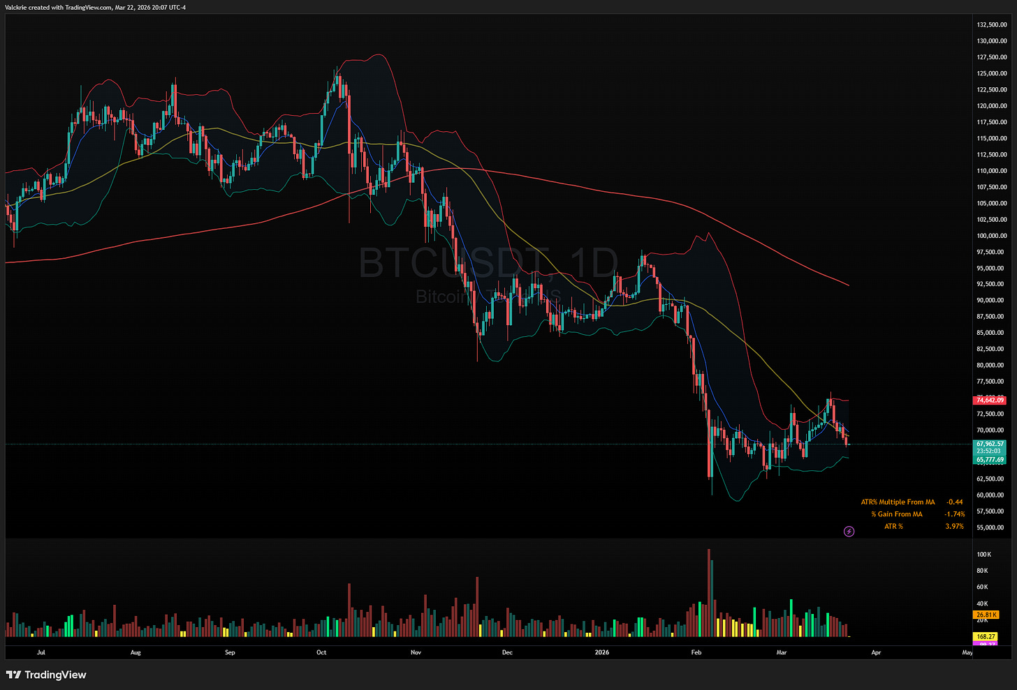 Crypto showed relative strength last week and briefly offered a glimmer of decoupling potential. Monday’s session offered some follow-through, but the breakout attempt failed. Bitcoin faded through the week, closing near the $68,900-$69,300 range. A failed breakout in this environment is not surprising. The longer-term downtrend from the February highs remains intact.