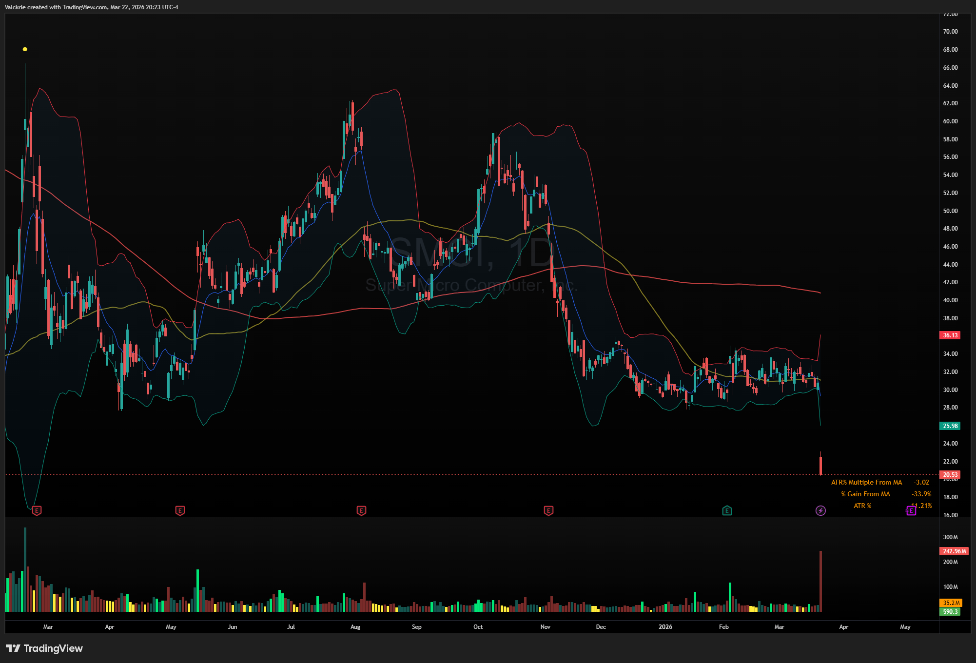 SMCI 0.00%↑: Tumbled 33.3% following chip smuggling charges against its co-founder. A headline-driven collapse of that magnitude rarely finds an immediate floor.