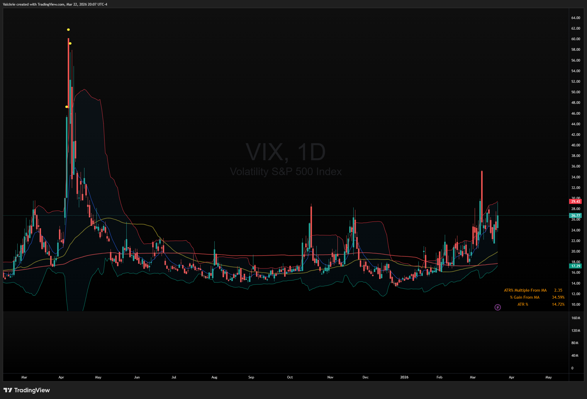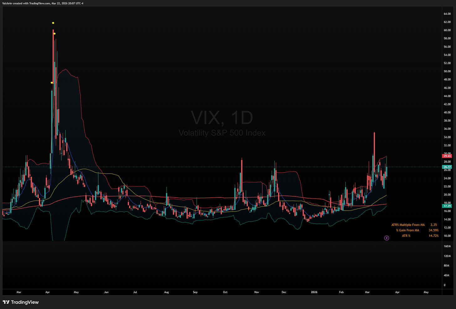 The VIX closed Friday at 26.77, up over 11% on the session, spiking sharply as equities sold off into the weekend. Over the past month, the index has holding above the 20s, signifying an elevated volatility regime, reflecting persistent uncertainty in the markets.