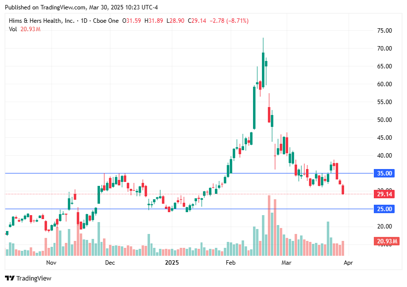 HIMS 0.00%↑ has been selling off for multiple days in a row. If there is a sharp move and range expansion with volume capitulation into the 25 support area, could bounce