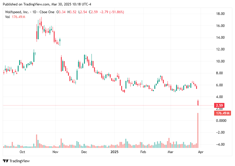 WOLF 0.00%↑ hit 52 week lows with bad news on Friday: “Wolfspeed struggling to refinance convertible bonds, Bloomberg reports”
