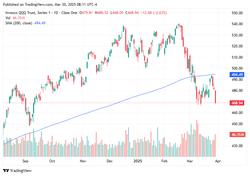 QQQ 0.00%↑ the recent rally attempt quickly fizzled and closed with a bearish engulfing week. The important 200 SMA area was also rejected and downside seems likely this week. There is an important tariff deadline on April 2nd which will be market moving.