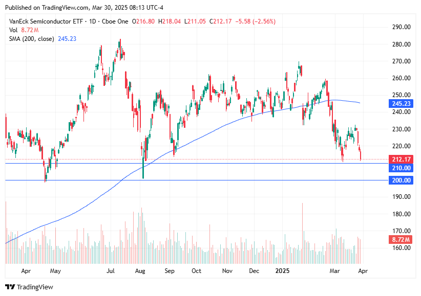 Semiconductors SMH 0.00%↑ saw a big drop with the market this week. Below $210 would be a new low with next level around $200. Many stocks in the sector have been sold off for multiple days. Any bounce attempt would need the broader market and semi ETF to be in alignment