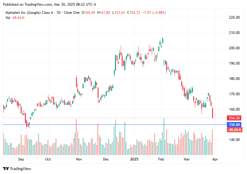 GOOGL 0.00%↑ some range expansion and volume increasing on Friday. Potential bounce if gap down exhaustion into the $150s area