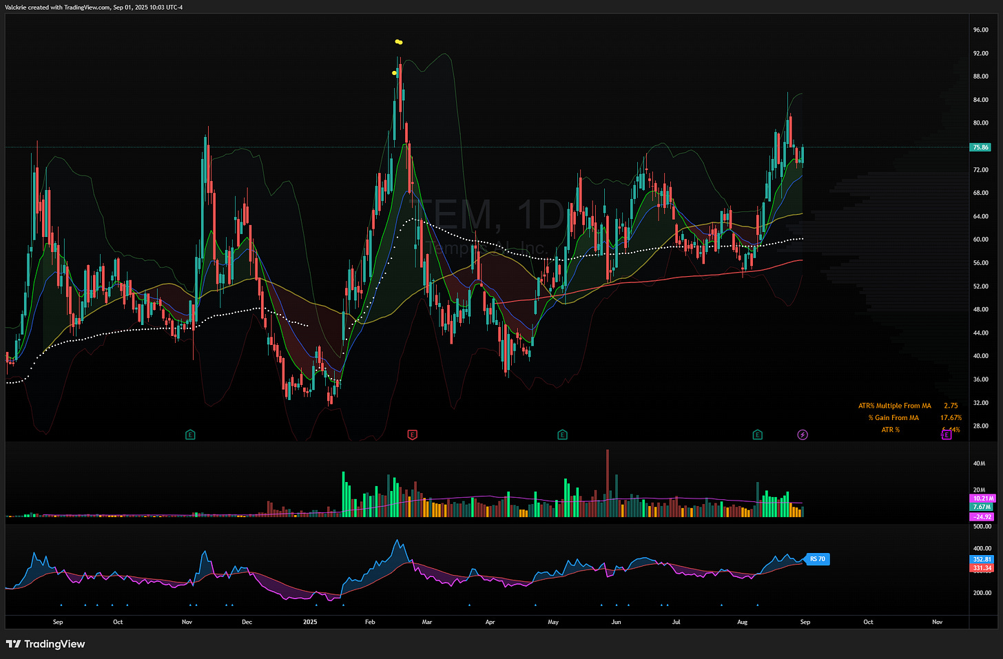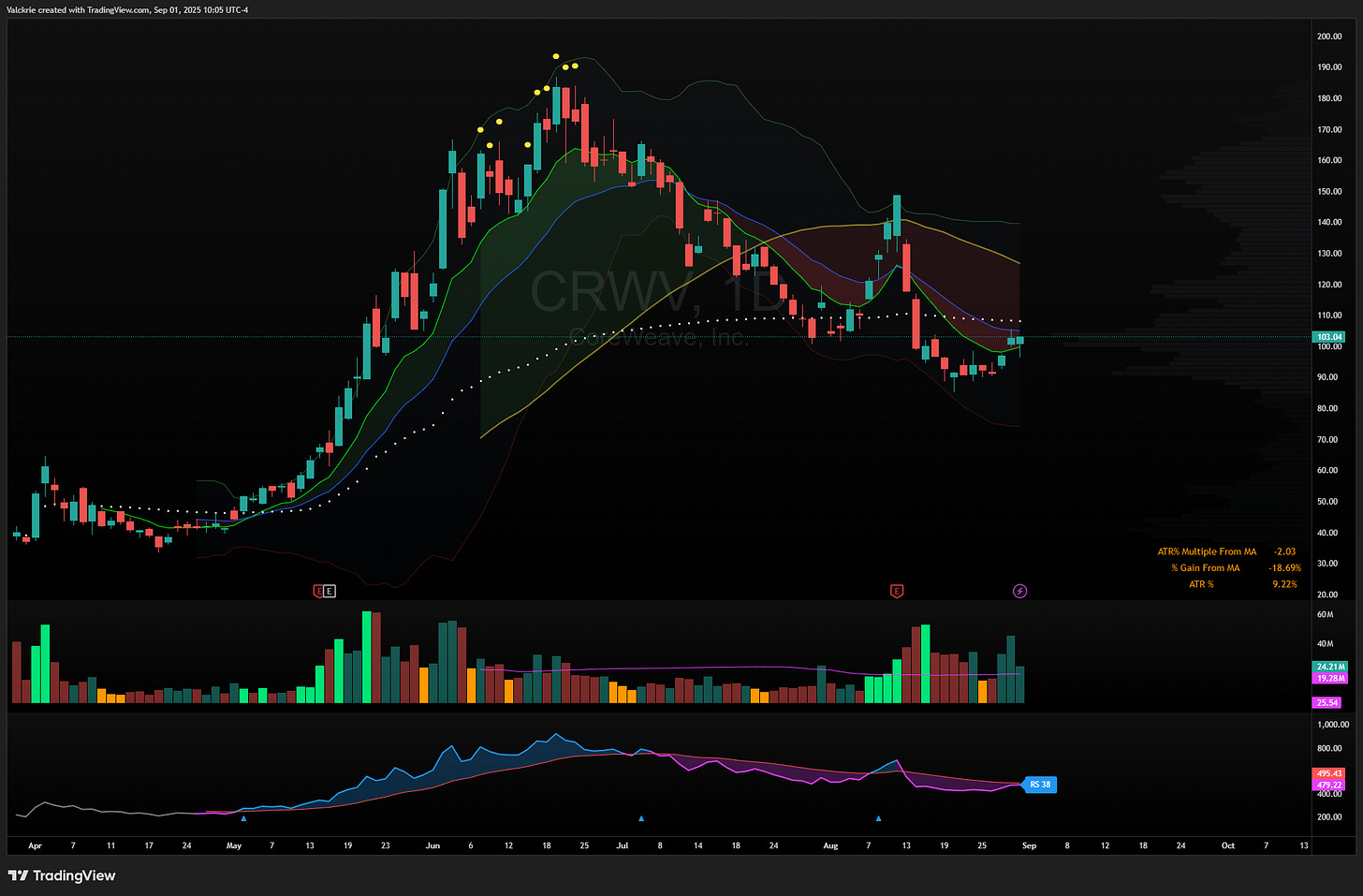 CRWV 0.00%↑ showing strength post-NVDA earnings as datacenter demand remains firm. Consolidating around the 100 level.