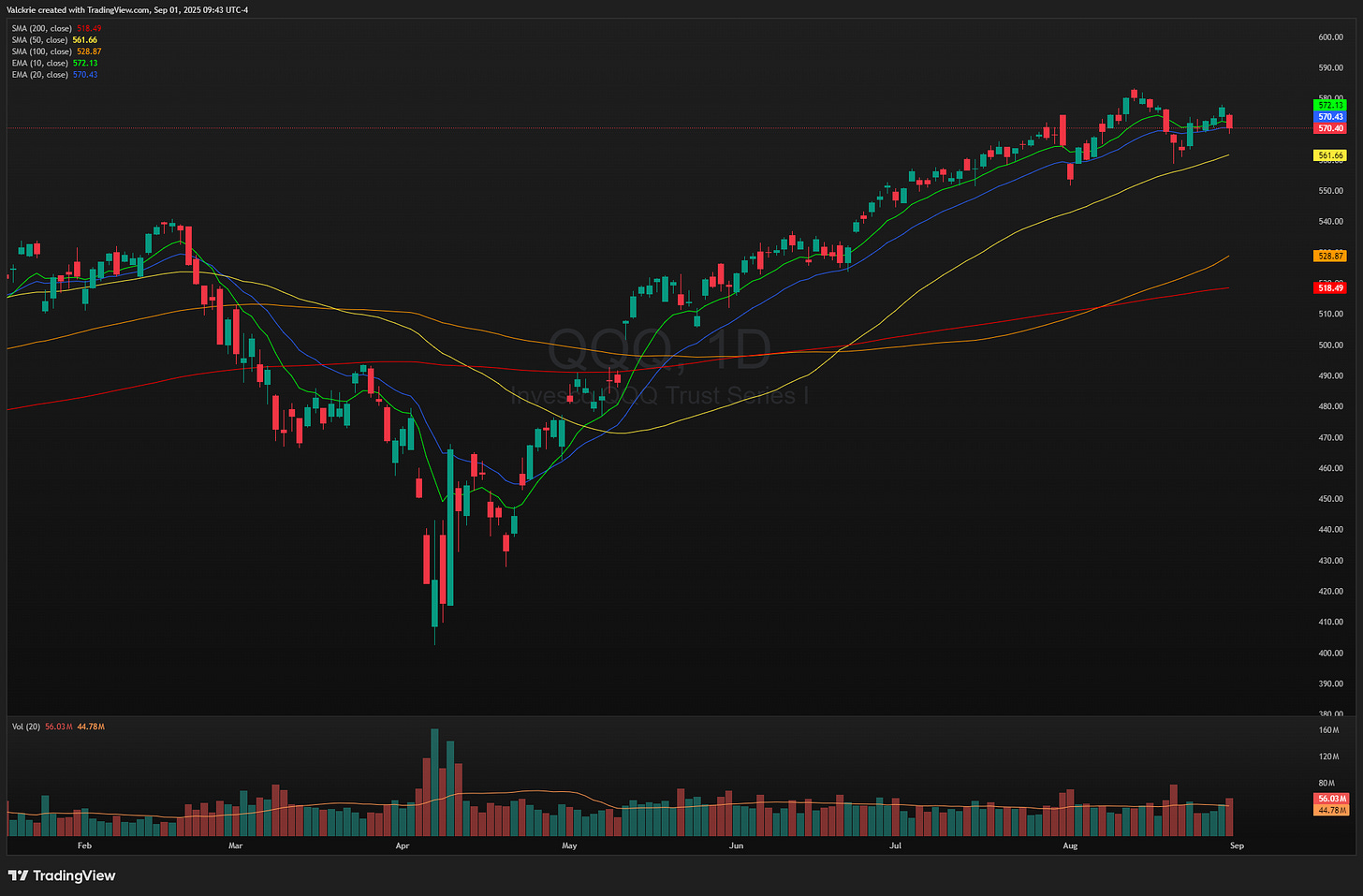 QQQ 0.00%↑ attempted to break higher following Jackson Hole but failed, slipping back into its short-term range. On a broader view, this near-term weakness could mark a potential lower high in the trend. While the overall setup does not yet point to a major correction, indices may be entering a phase of consolidation or gradual downside as we head into September, historically one of the weakest months seasonally.