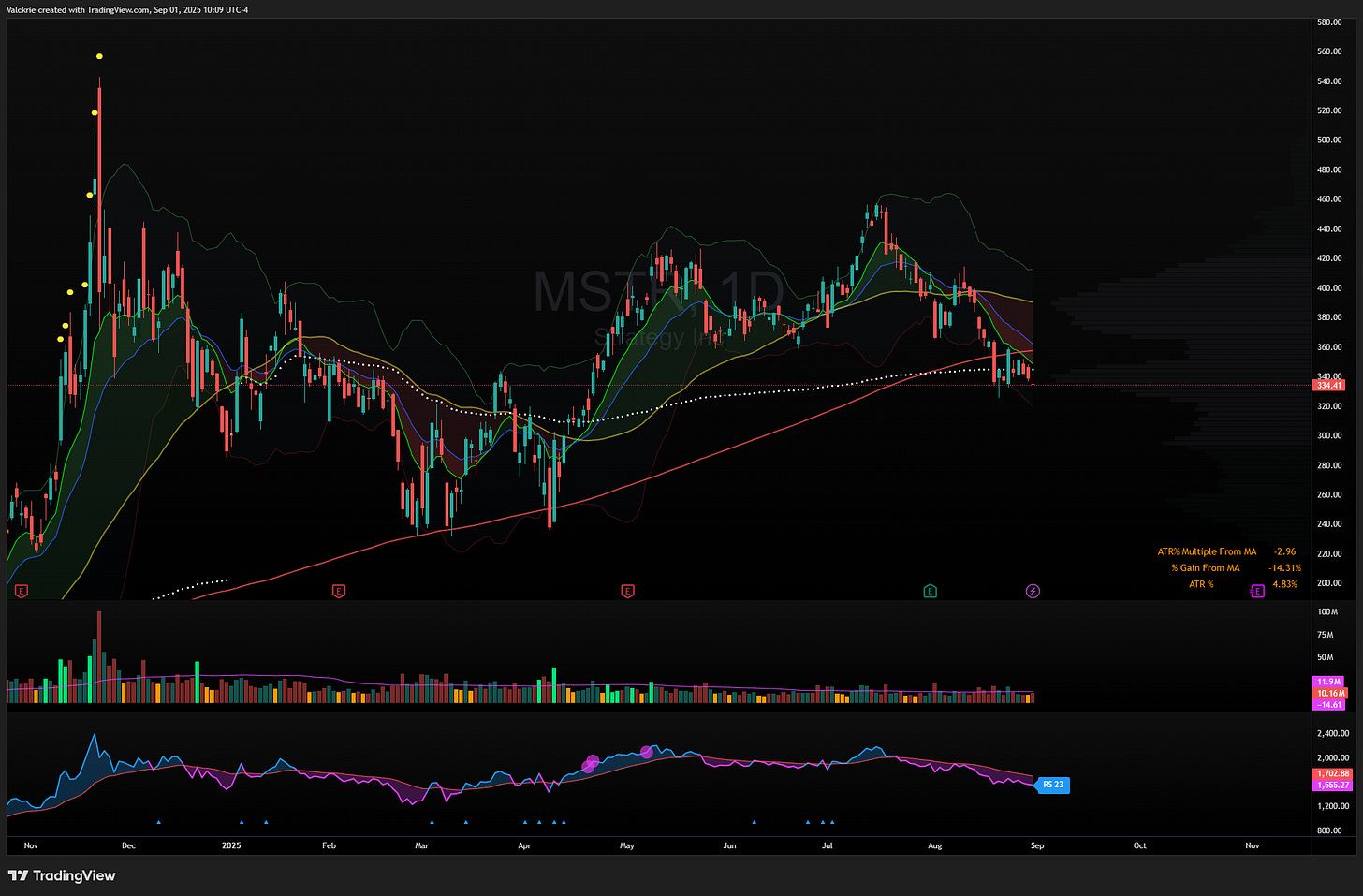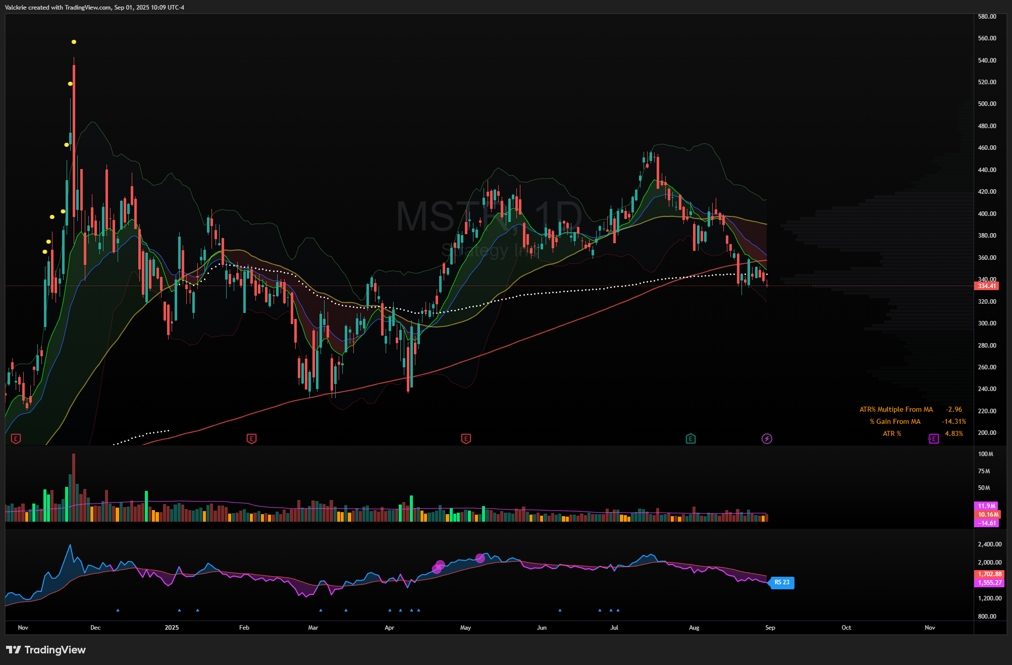 MSTR 0.00%↑ consolidating below the 200 MA, pressured by Bitcoin weakness.