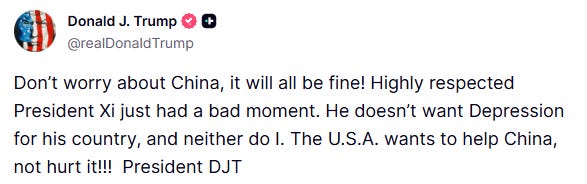 In fact, at the time of writing, President Trump has just posted on Truth Social, urging people “not to worry about China.” This underscores the importance of staying alert to rapidly changing news developments.