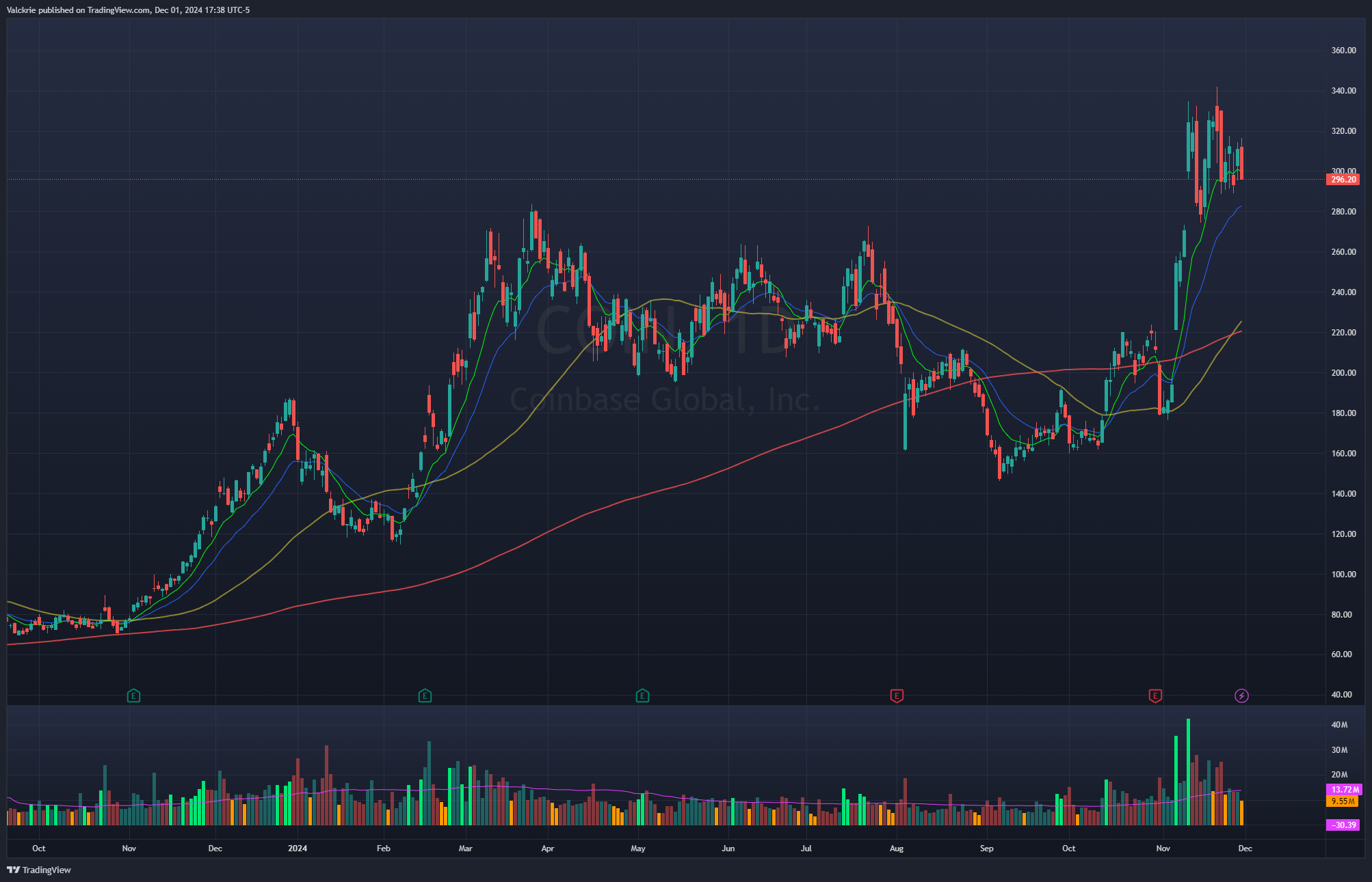 COIN 0.00%↑ has been consolidating since the move from election. $BTC breaking $100k could get this to break out of its range