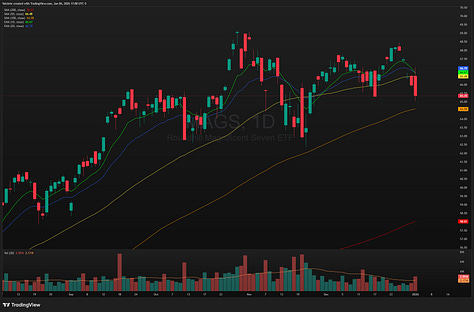 Rising geopolitical tensions also keep precious metals in focus. Gold GLD 0.00%↑, Silver SLV 0.00%↑, and Platinum PPLT 0.00%↑ all experienced parabolic blowoff style reversals at the end of last year. Gold is currently trading below its short term 10 and 20 day EMAs after failing to make a new high in December, while Silver has so far held the key 70 support area following its reversal, with a decisive break of that level opening the door for a potential short setup.