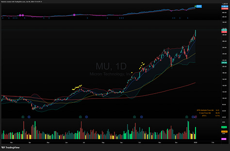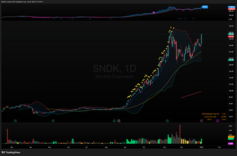 Memory stocks continue their ascent after a strong end to last year. While MU 0.00%↑ has already broken out, SNDK 0.00%↑ is near ATH and WDC 0.00%↑ also has a breakout level.