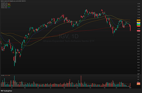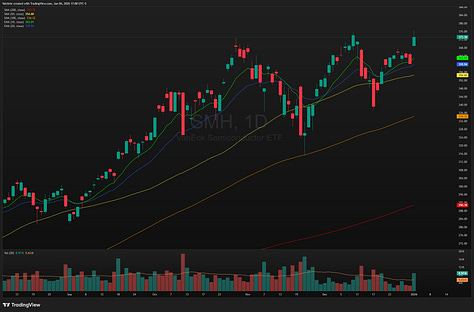 The first day of the new year then brought heightened volatility and disperion in the market, highlighted by sharp selloffs in megacap stocks MAGS 0.00%↑ and software IGV 0.00%↑, while the SMH 0.00%↑ rallied to an all time high.