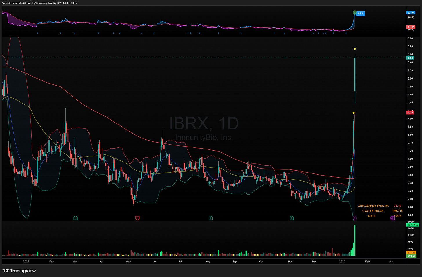 IBRX 0.00%↑ saw huge volume and has exploded 200% off lows from $2 to $6 in Fridays afterhours session, after gaining attention on the X platform as well as having a large short interest of 35% float short. The stock is on watch for a mean reversion short trade when the momentum turns.