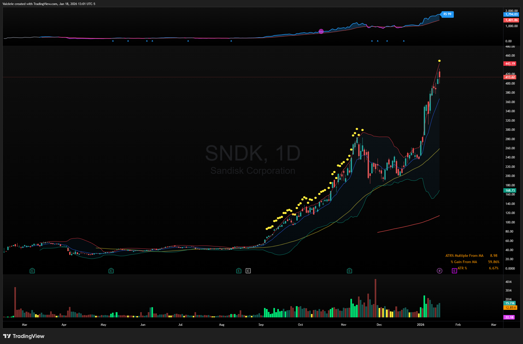 In semiconductors, the memory space remains dominant, with MU 0.00%↑ and SNDK 0.00%↑ continuing to make new highs and leading sector momentum.