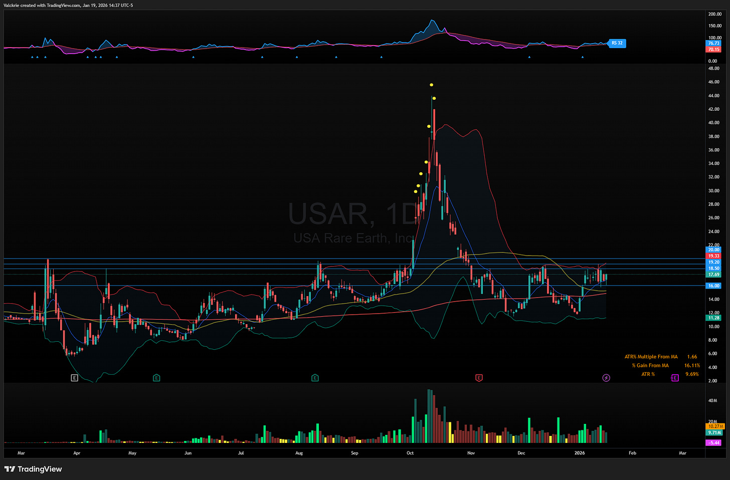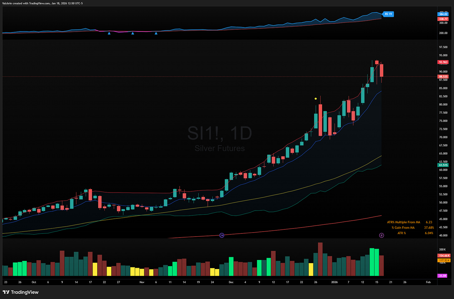 Precious metals continue to be on watch as silver SLV 0.00%↑ continues its parabolic ascent. On the rare earths minerals side some stocks like USAR 0.00%↑ are approaching breakout levels: