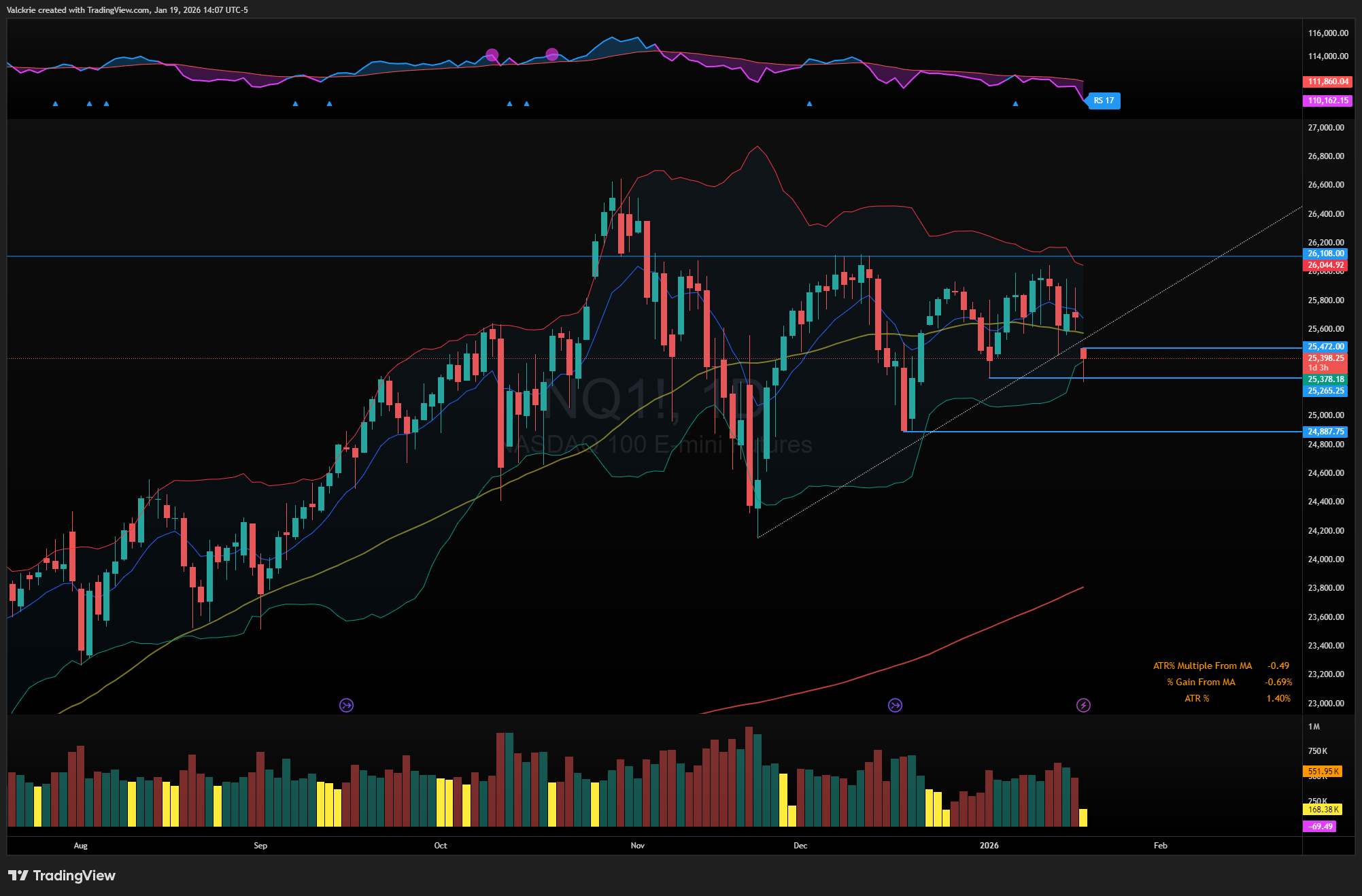 Despite Monday being a market holiday, futures remained open and NQ gapped down -1%. From a technical perspective, price traded directly into the prior low near 25,265 and managed to bounce off those levels throughout the session. That area represents the last higher low in the trend and now acts as an important pivot, as a clean break below it could open the door to a deeper pullback, especially with price currently trading beneath the 50 day simple moving average. Outside of equities, both gold and silver continued to push higher, extending their recent strength despite the weakness seen in index futures.