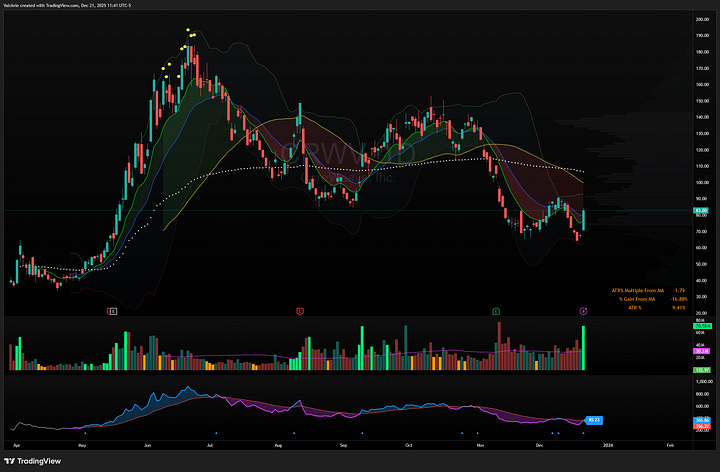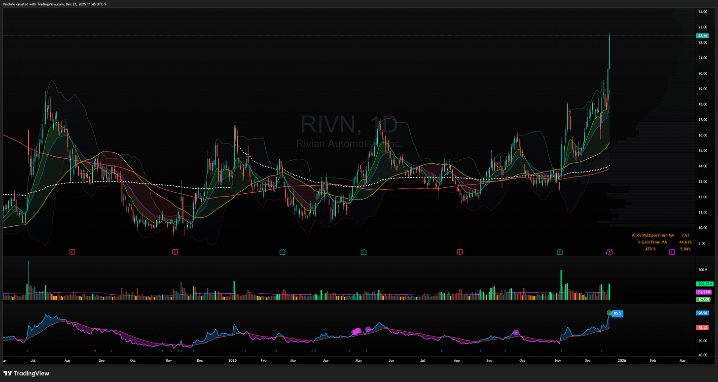 RIVN 0.00%↑ is breaking out from a lengthy stage 1 base, making new 52-week highs and trading at levels not seen since early 2024. The move is supported by several fundamentals, including posting its first-ever consolidated gross profit in Q3 2025, a shift toward higher-margin autonomy and AI initiatives, an improved funding position and capital discipline highlighted by the Volkswagen partnership, and anticipated strong demand for the more affordable R2 platform.