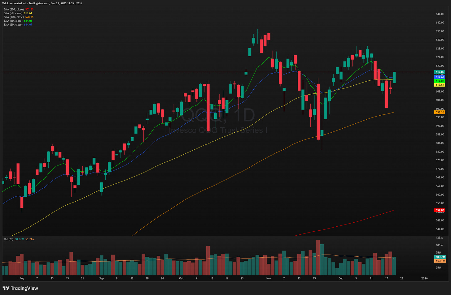 Thursday marked a sharp turnaround, as the market gapped higher following softer than expected CPI inflation data. Adding to the positive shift in sentiment, MU 0.00%↑ delivered standout earnings, widely viewed as one of the largest beats and surprises in US semiconductor history, second only to NVDA 0.00%↑’s breakout moment in 2023. The week finished on a strong note, with Friday seeing QQQ 0.00%↑ break its short term downtrend as price rallied back above the 50 day SMA as well as the shorter term 10 and 20 EMAs. That move was further supported by news of a reported $100B OpenAI funding round valuing the company at around $830B, which appeared to ease investor concerns and helped Oracle bounce as a significant portion of its backlog is tied to OpenAI.