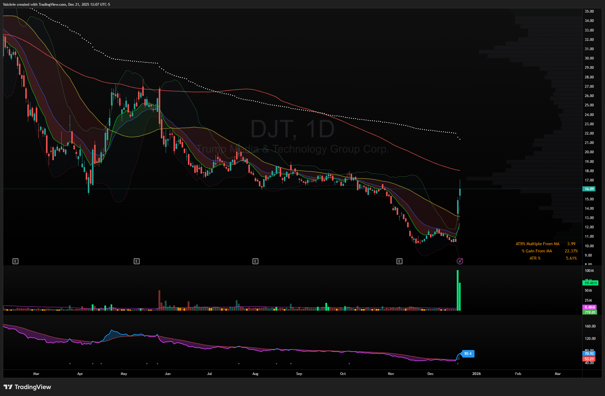 DJT 0.00%↑ shares are trading higher after Trump Media & Technology Group signed a merger agreement with TAE Technologies. The stock has seen heavy volume over the past two sessions but remains in a longer-term downtrend.